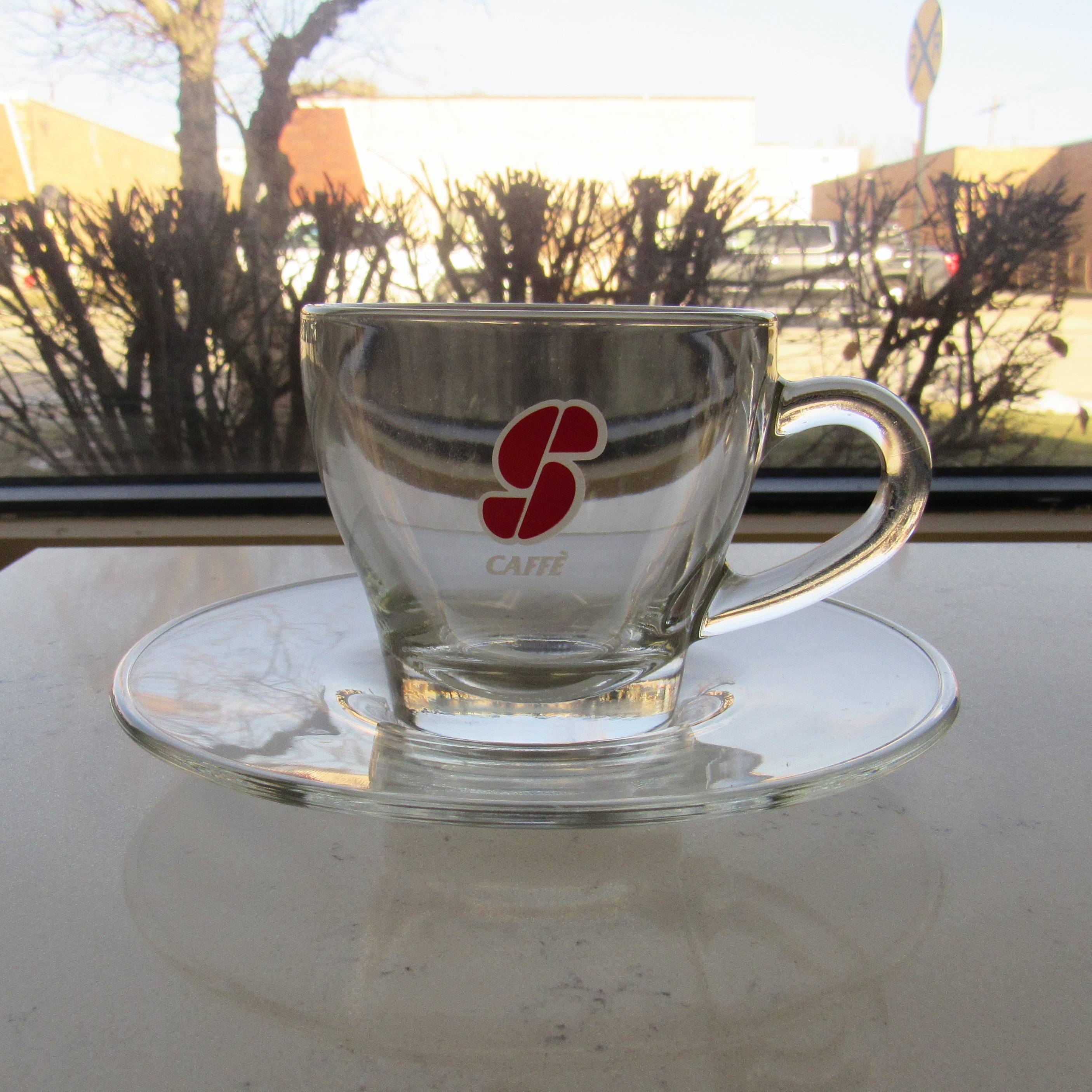 Glass cups with a saucer by Essse Caffe. Enjoy your morning espresso with this stylish set of glass cups.